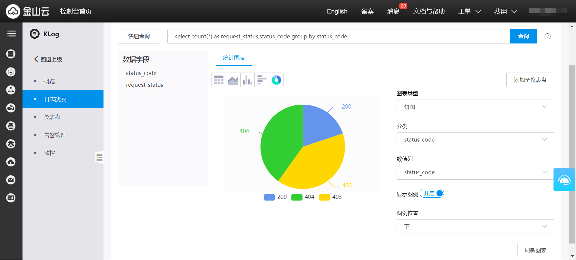 请求状态占比:下图展示本月内各请求状态的占比情况,所关联的查询分析语句如下:
