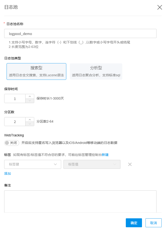 日志池名称:参照页面中的名称格式要求,定义日志池名称,名称保存后不支持修改。以”logpool_demo“为例。