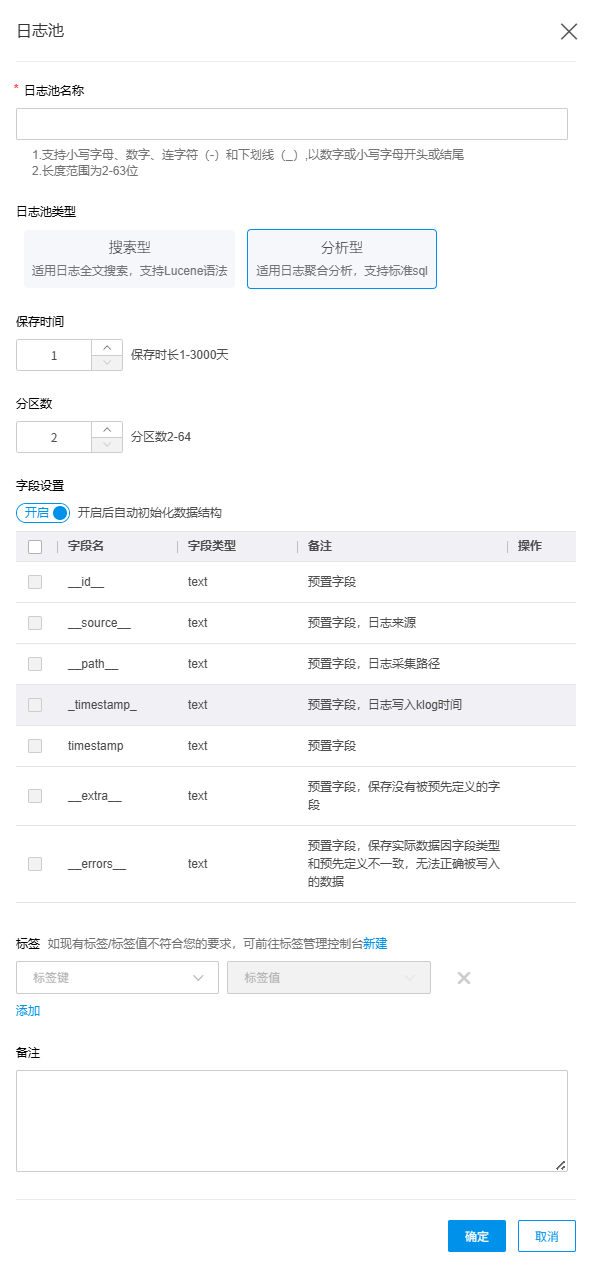 分析型日志池支持开启字段设置功能,系统会自动初始化数据结构并提供以下预置字段: