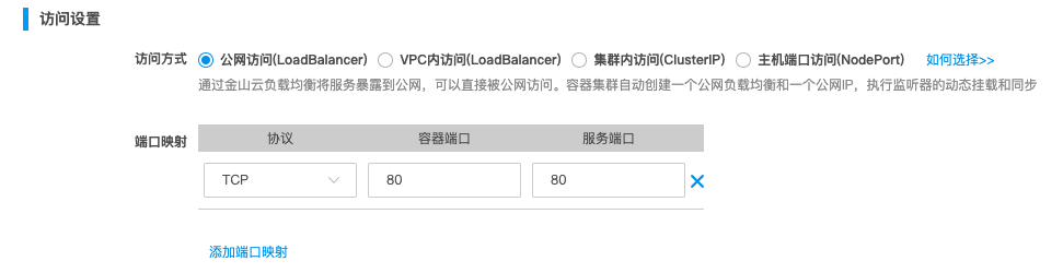 设置访问方式:金山云容器服务提供四种访问方式,详细配置方式将在后文进行说明。