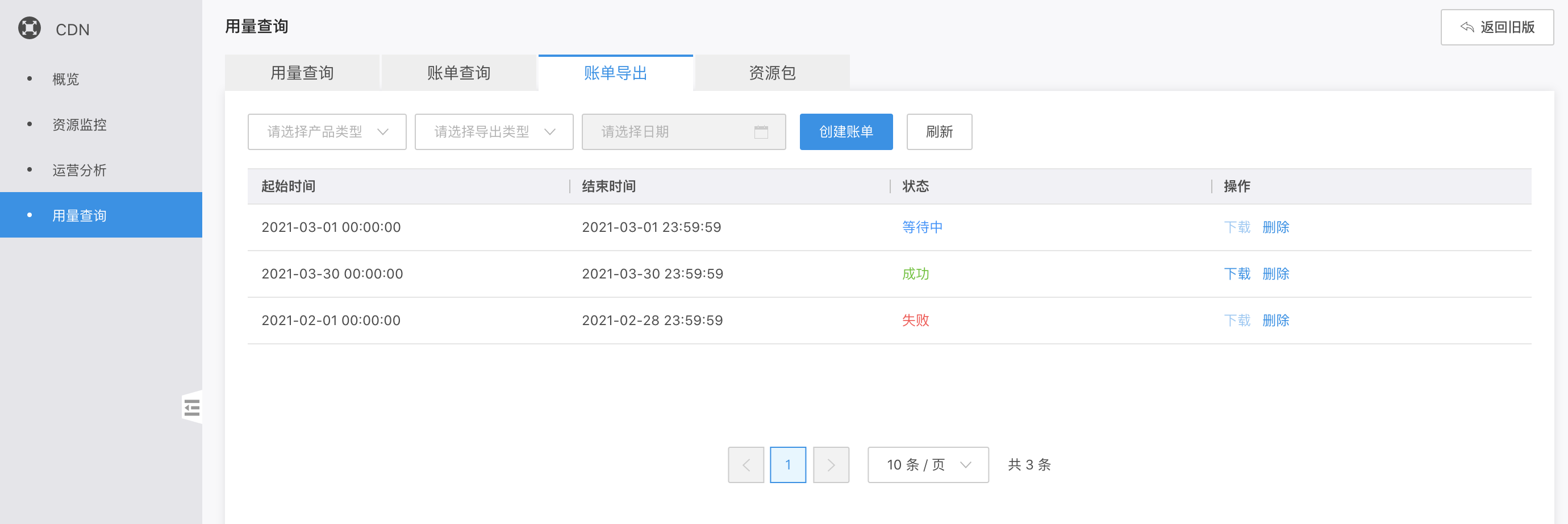 您可以根据所需按日或按月导出CDN账单。导出CDN账单后,您可以下载,并保存为PDF格式,便于您及时了解其收费明细,更好地进行业务决策。