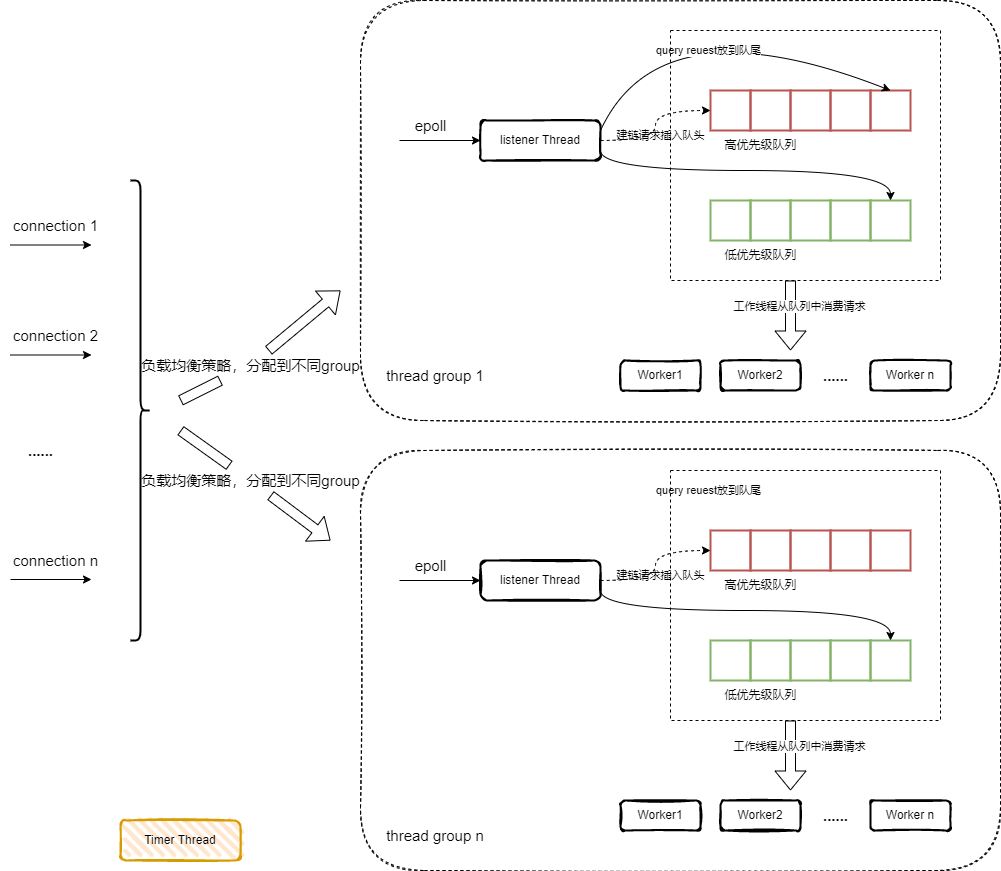 thread group: 整个线程池被划分成N个group,每个group创建一个epoll句柄,对应一组工作线程,以及高低两个队列,各group间独立,group内epoll上获取的请求由该group内工作线程处理。