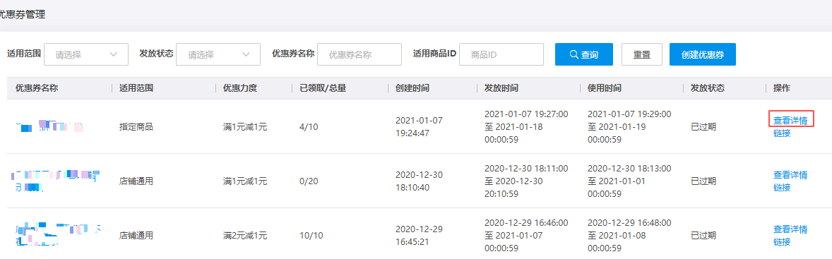 您可在到优惠券管理列表页中,单击查看详情按钮,进入优惠券的详情页查看相关内容。