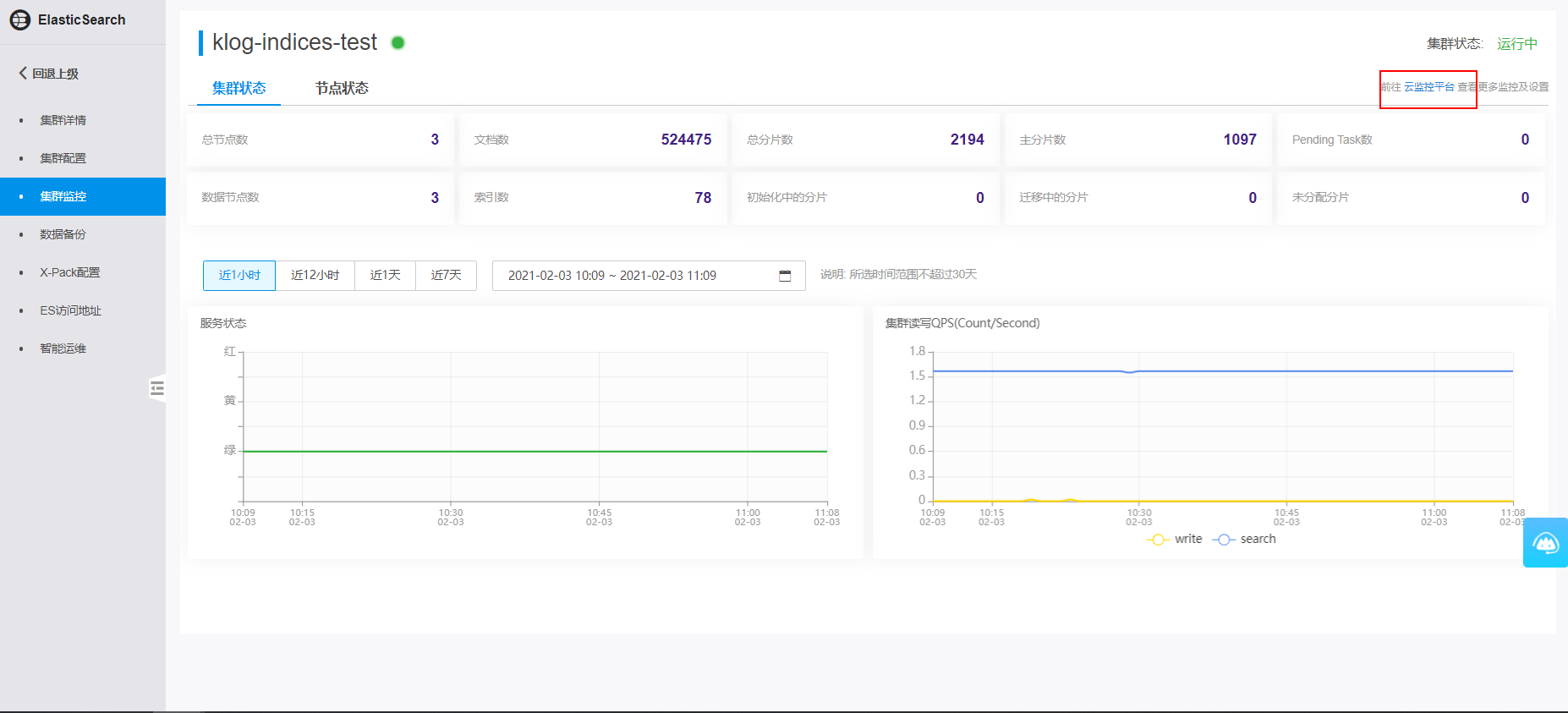 2.在集群列表页操作栏点击监控,或在集群详情页的左侧导航栏点击集群监控进入集群监控页。