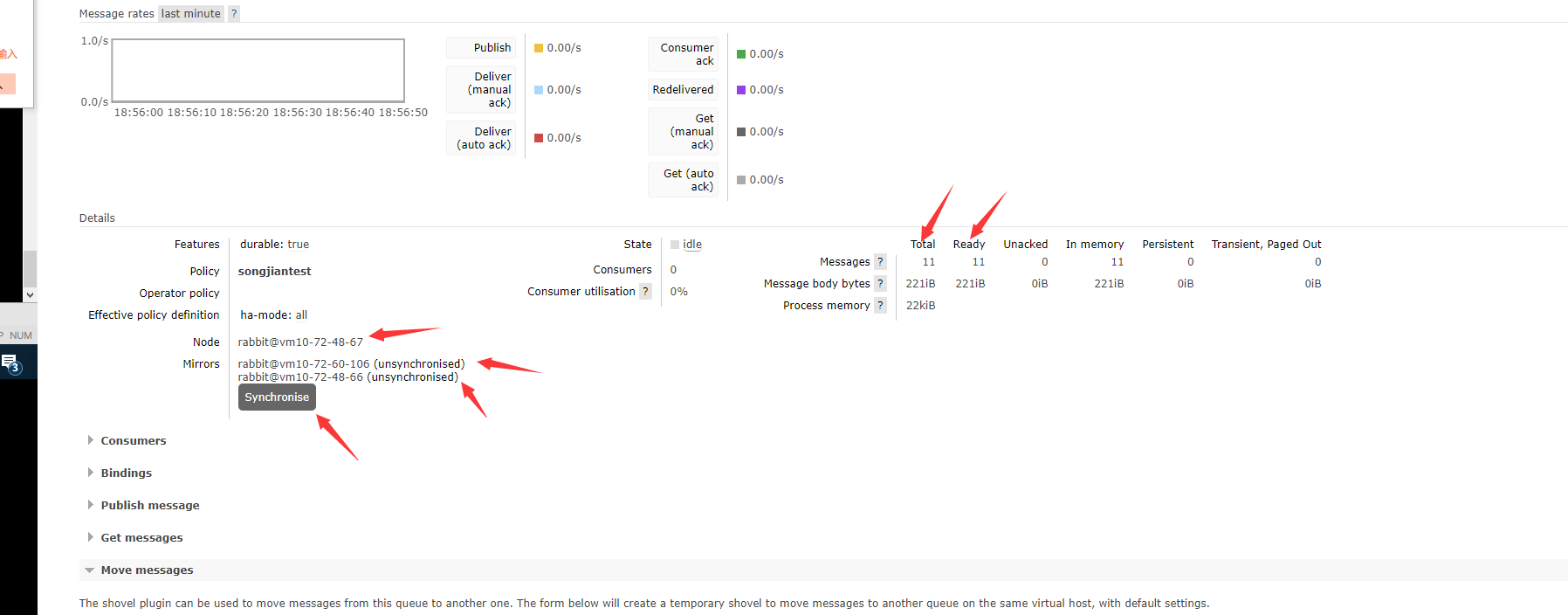 3.如果queue中有存量未消费的消息时,则需要手动触发同步才可进行数据的复制(同步期间会引起阻塞),红色箭头指向部分代表需要手动同步存量消息,如果没有则说明不需要单独同步存量消息。(如果policy设置后,消费者消费完了存量消息,则会自动变成正常状态,此时就无需手动同步了)