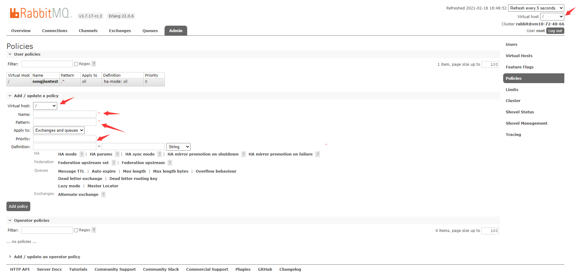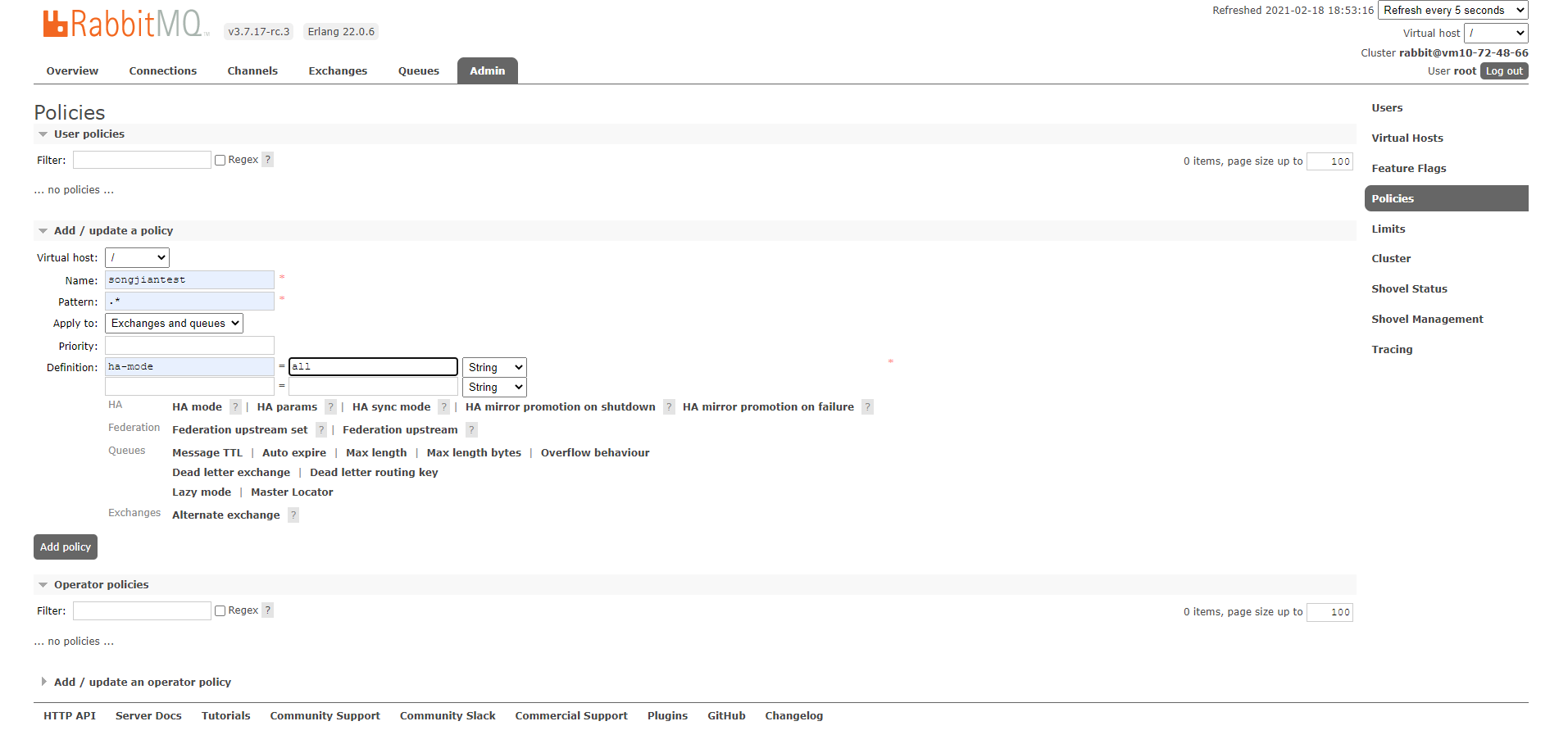 2.如对vhost /,中所有的队列设置则按以下内容填写,并点击Add policy: