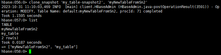 从快照中创建一个新表(克隆操作),新表中包含拍摄快照时的相同数据。通过快照my_table-snapshot2克隆出一个新表myNewTableFromSn2: