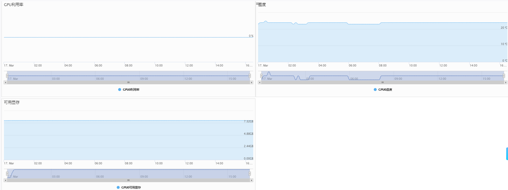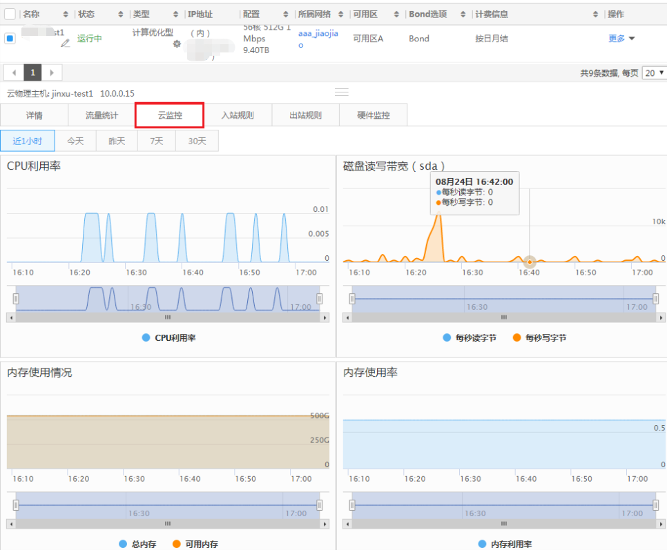 如果您在创建裸金属服务器时选择了免费开通云监控功能,点击您的裸金属服务器详情页中的 “云监控” 按钮,就可以监控到30天内的CPU利用率、磁盘读写带宽、内存使用情况、内存使用率、GPU利用率、GPU温度、GPU可用显存信息。