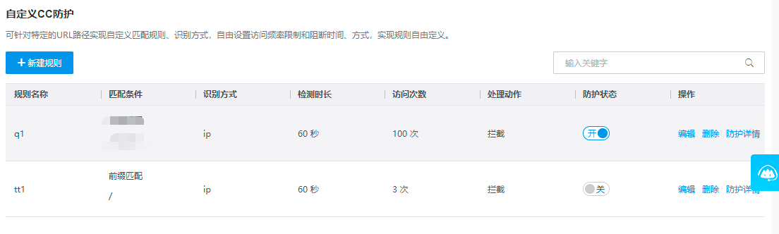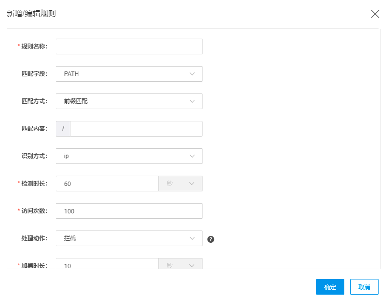| 加黑时长(秒) | 触发规则后,设置封禁时长,范围1~3600 |
