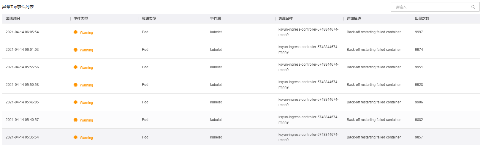 查看某个时间段内各类异常事件分布趋势。在趋势下方展示了可供搜索的异常事件列表,帮助您快速定位到问题。
