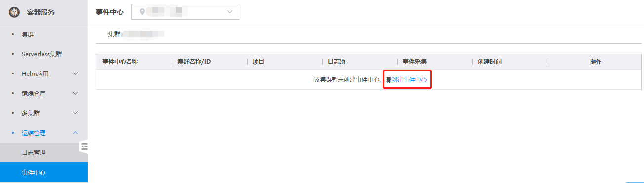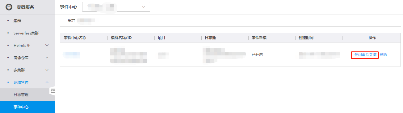 在左侧导航栏中,选择运维管理> 事件中心,选择需要关闭事件采集的集群,进入事件中心列表页。