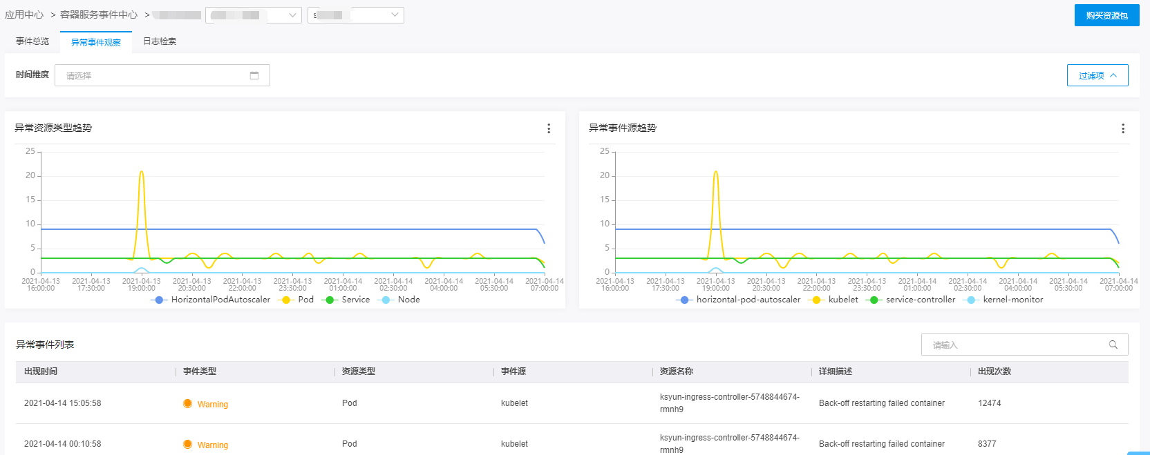 当创建容器服务事件中心后,容器服务自动为您提供开箱即用的事件仪表盘,您即可使用容器服务事件中心。包括两大功能模块:事件观察和事件告警,其中您可以根据需求查看事件总览、异常事件观察、日志检索、事件告警等操作。
