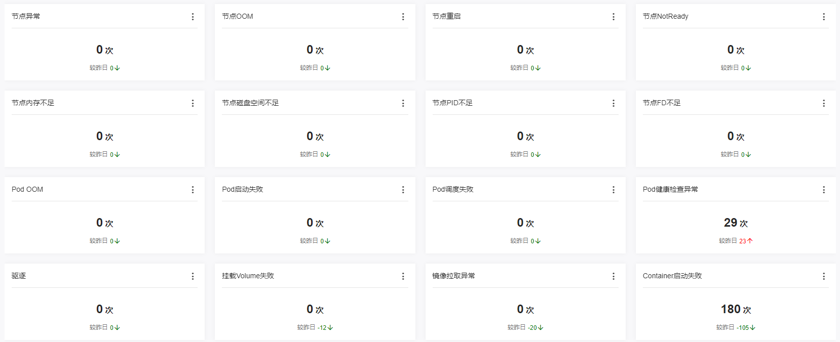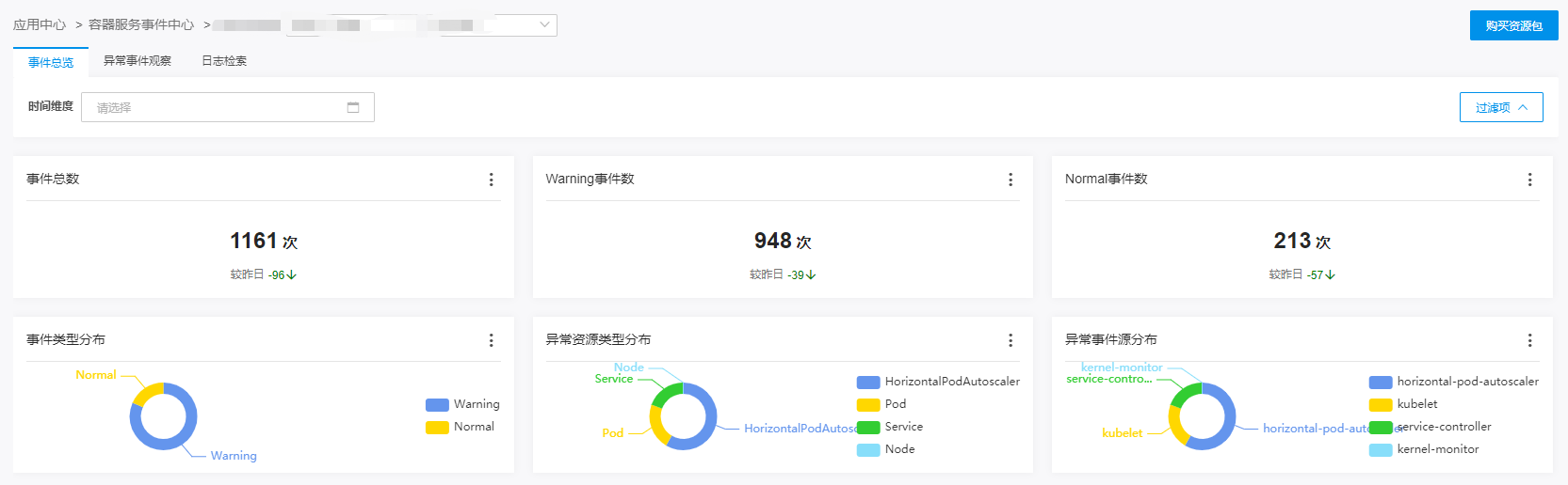 在事件总览页面,您可根据时间、命名空间、节点、事件类型、资源类型、事件源、原因等维度过滤事件,查看核心事件的汇总统计信息,并展示一个周期内的数据对比情况。