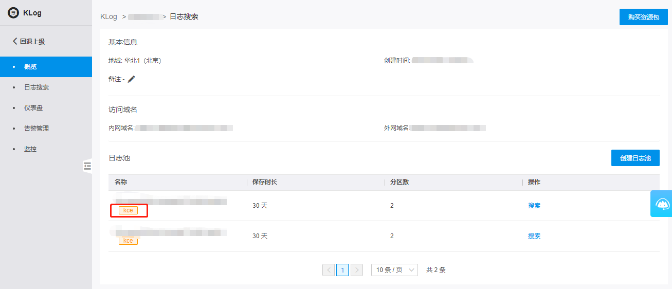 由容器服务控制台事件中心创建的日志池,该日志池带有KCE标识,用户可在日志服务控制台点击工程 列表 > 工程 详情页 > 概览,日志池列表页进行查看。