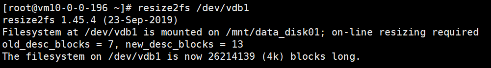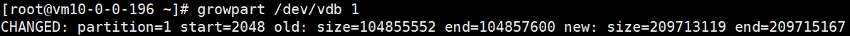 growpart /dev/vdb 1本文以扩容数据盘 /dev/vdb1 分区为例,/dev/vdb和1之间需要空格分隔。如果需要扩容其他分区,请根据实际情况修改命令。执行结果如下所示。