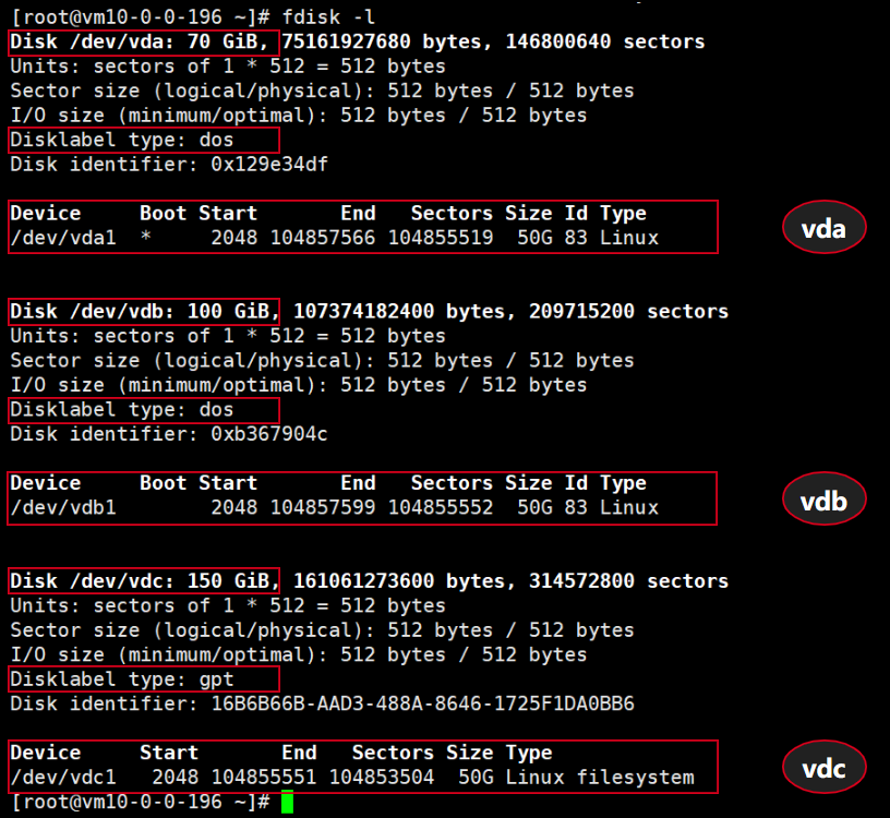 /dev/vdc,数据盘,云硬盘容量为150GB | /dev/vdc1 | GPT分区,分区容量为50GB |