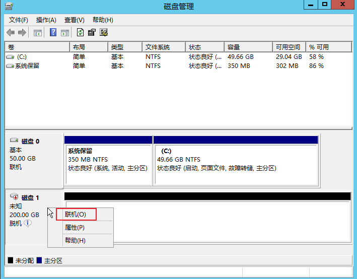 若新增磁盘处于脱机状态(如上图),需要先执行步骤4联机后再执行步骤5进行初始化。否则直接执行步骤5进行初始化。