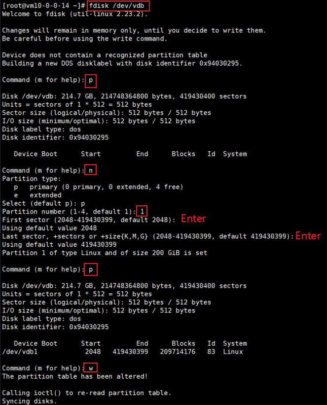 fdisk /dev/vdb按照界面的提示,依次执行以下步骤: