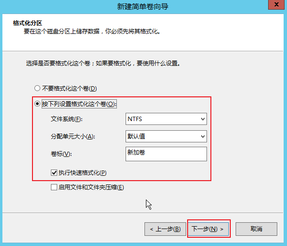 选择按下列设置初始化这个卷,并根据实际情况设置参数,初始化新分区,单击下一步完成分区创建。