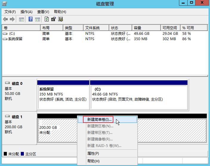 在磁盘管理对话框,右键单击磁盘1的未分配区域,选择新建简单卷。