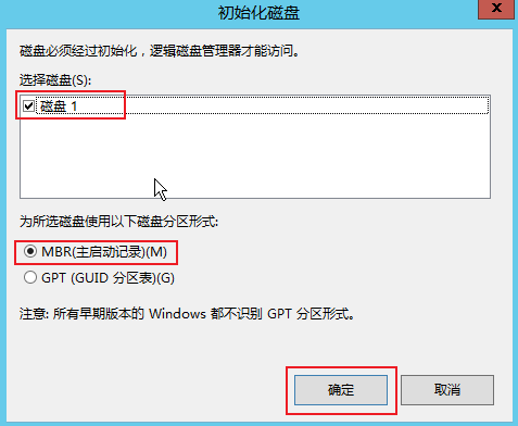 在初始化磁盘对话框里,选择磁盘1,并选择相应磁盘分区形式,本例中选择MBR分区形式,单击确定。