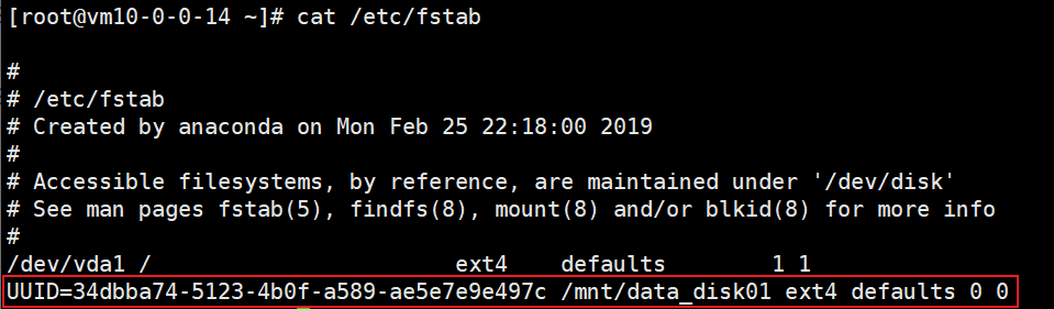 echo '/dev/vdb1 /mnt/data_disk01 ext4 defaults 0 0' >> /etc/fstab执行cat /etc/fstab命令,查看自动挂载配置。