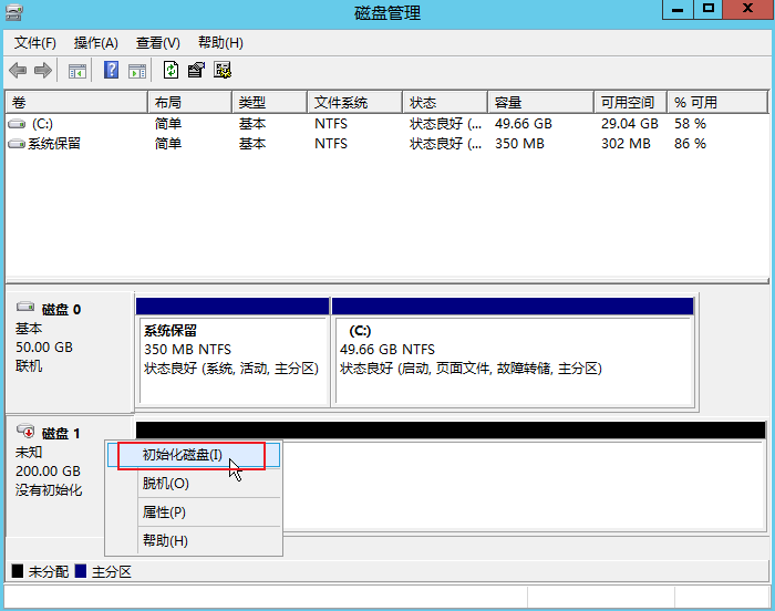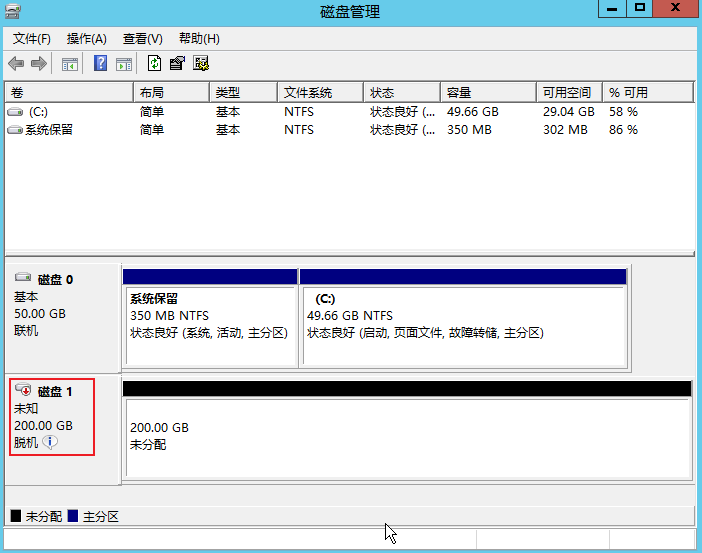 在磁盘管理对话框的磁盘列表中,选择待初始化的数据盘,本例中为磁盘1,磁盘默认为脱机状态(其中,磁盘0是系统盘,磁盘1是数据盘)。