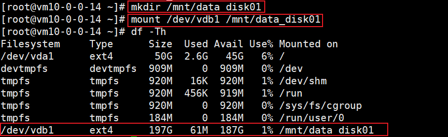 mount /dev/vdb1 /mnt/data_disk01执行以下命令,查看新分区信息。