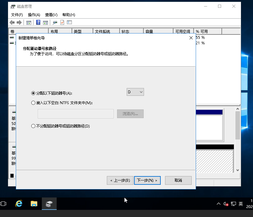 2.在分配驱动器号和路径对话框中,选择分配以下驱动器号,并选择盘符名称(本示例以D为例),然后单击下一步。