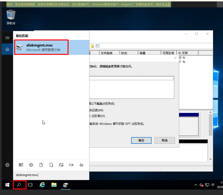 选择 “开始”,键入 diskmgmt.msc,然后选择 Enter。