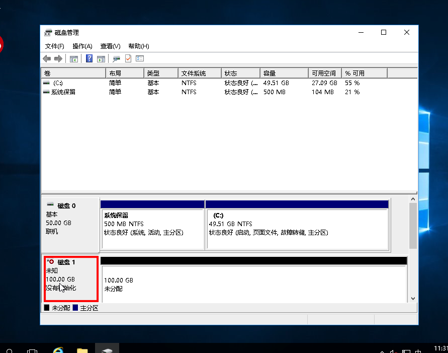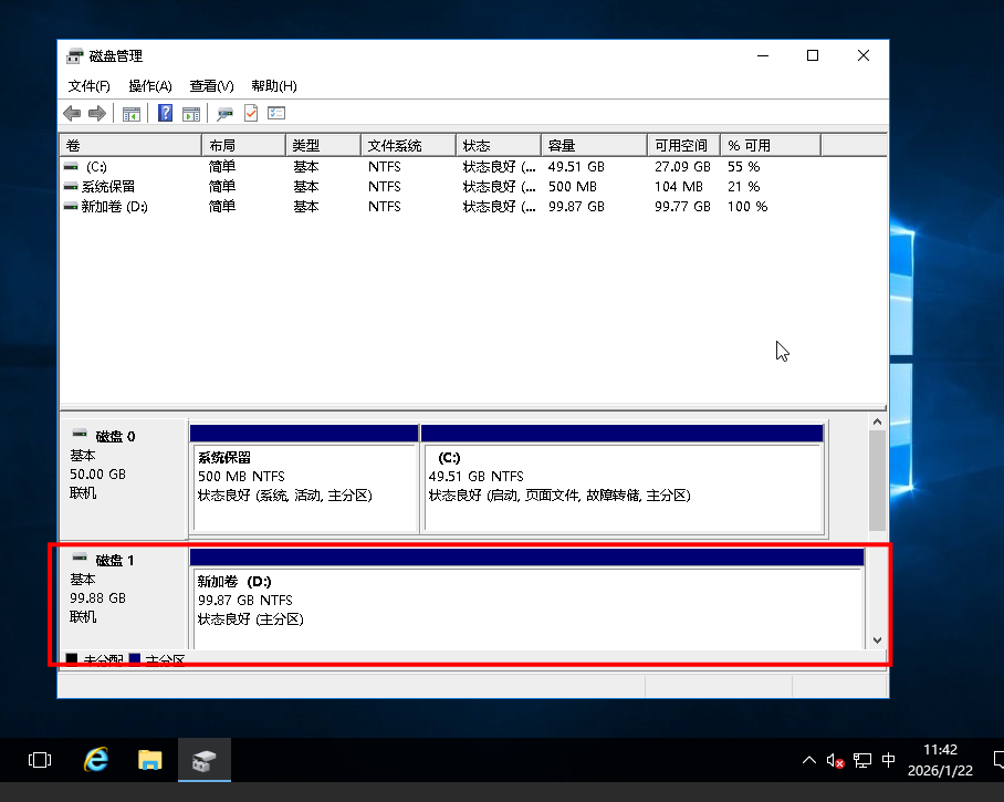 初始化完成后,磁盘管理中磁盘 1的状态如下图所示。