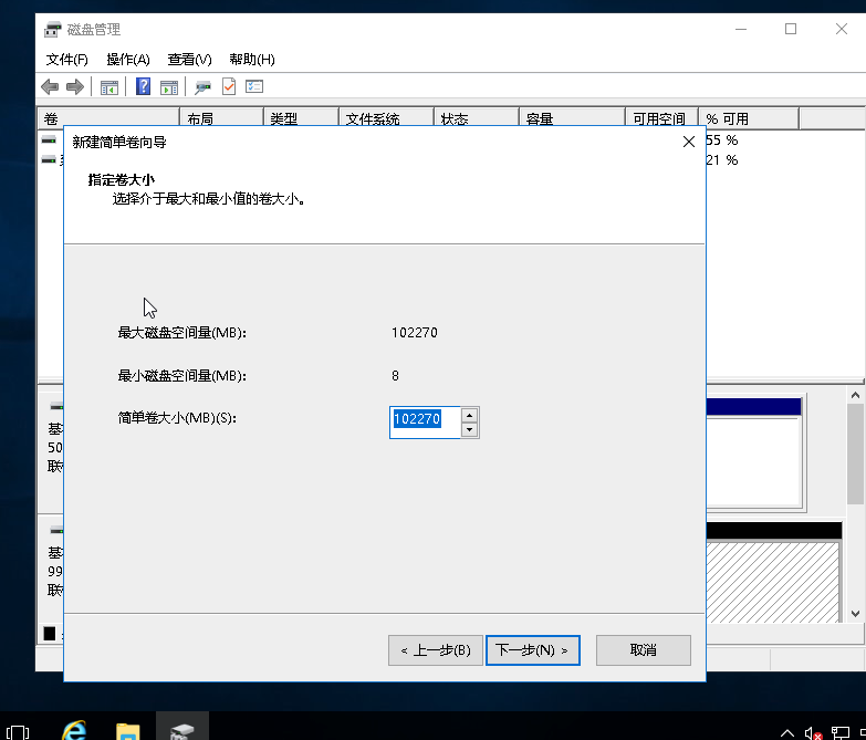 1.在指定卷大小对话框中,设置简单卷大小,然后单击下一步。