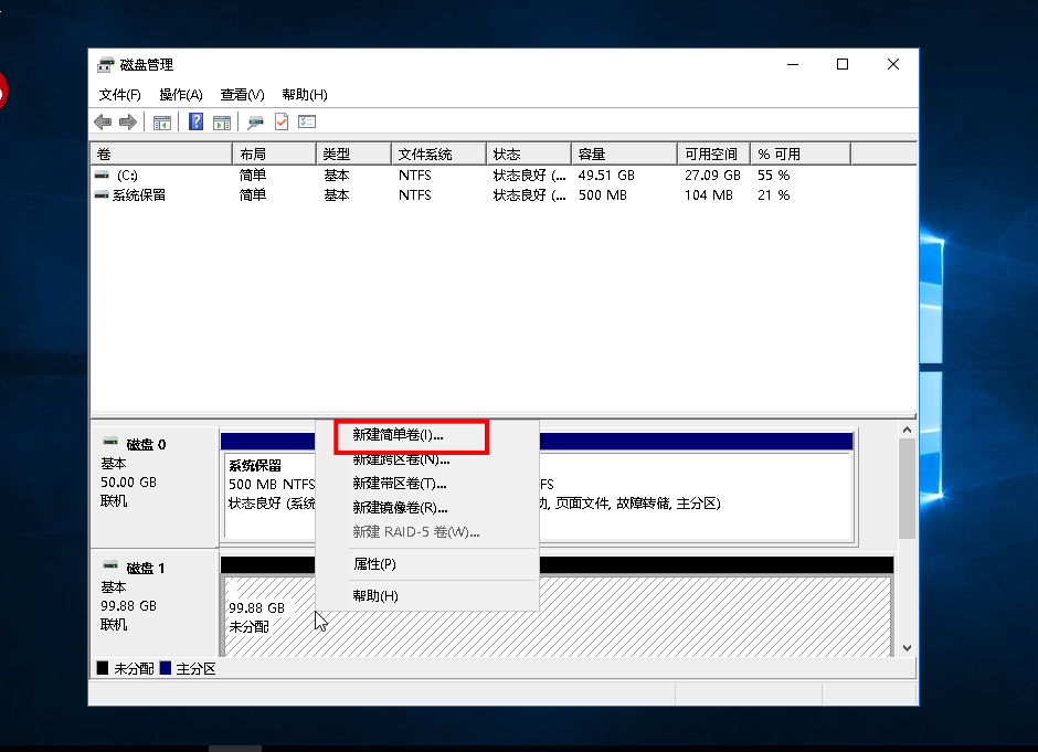 右键单击磁盘 1的未分配区域,选择新建简单卷。