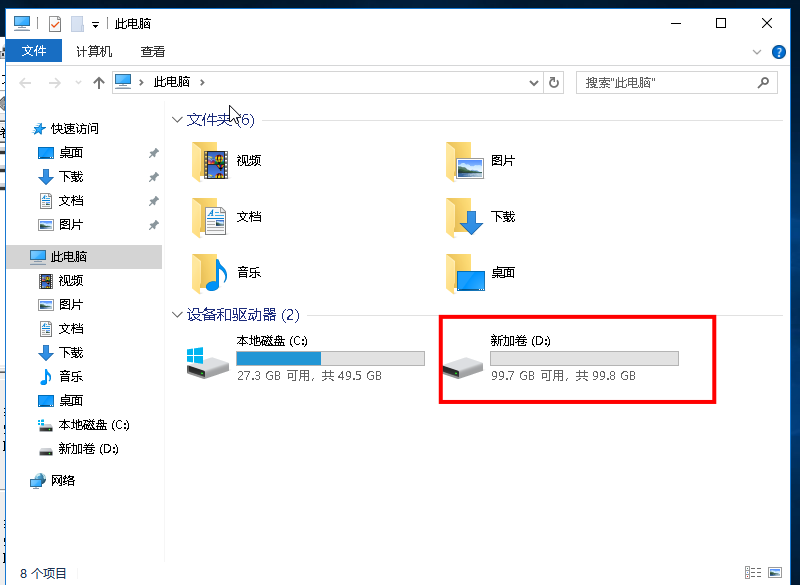 您可以在这台电脑中查看到新建的驱动器新加卷 (D:)。至此,您可以使用这个数据盘了。