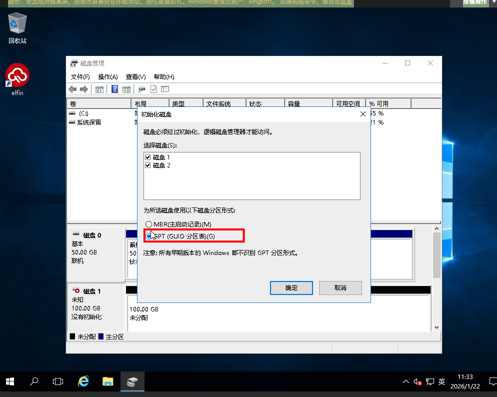 在初始化磁盘对话框,选择目标磁盘和磁盘分区形式,然后单击确定。