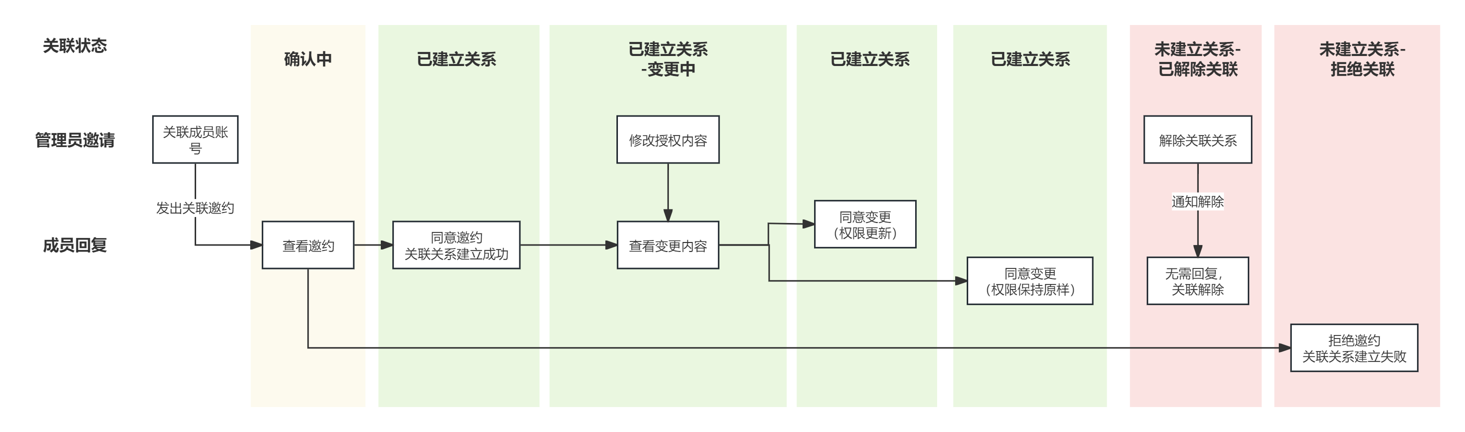 已建立关系-变更中 | 建立授权关系后,管理员修改了授权内容,等待成员账号回复变更。 | |