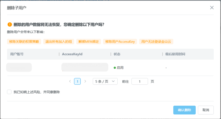 在弹出的确认是否删除用户窗口,勾选知晓上述风险,单击“确认删除”,完成删除子用户操作。