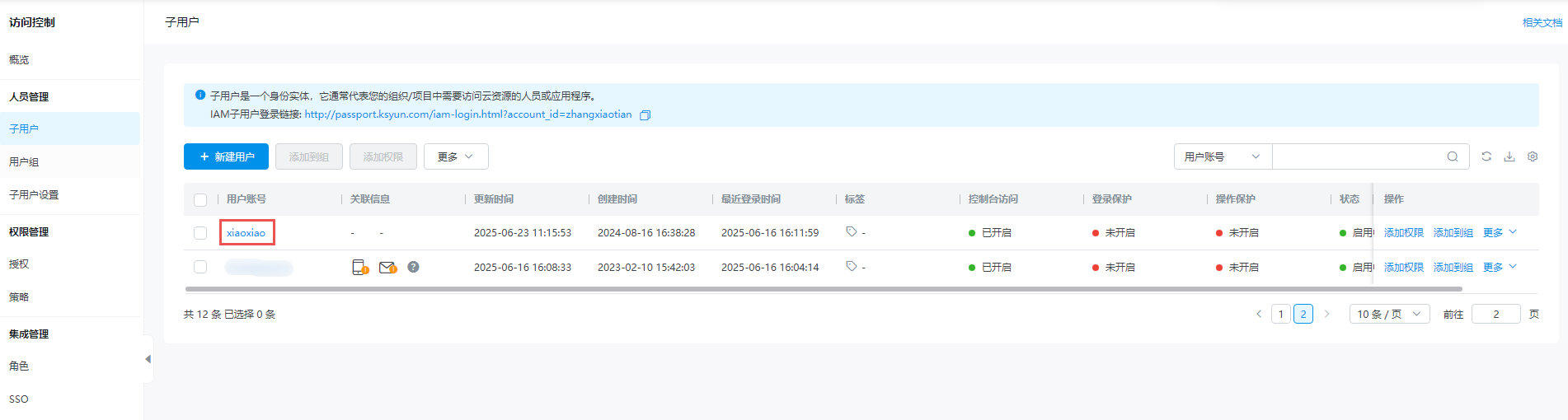 控制台访问开启:开启后,子用户可以通过金山云控制台登录来查看或者管理云资源;