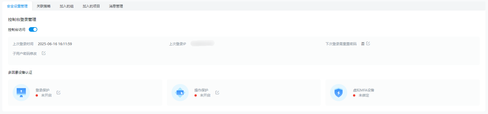 控制台访问开启后,主账号可以给子用户设置多因素设备认证相关信息。详情:多因素设备设置