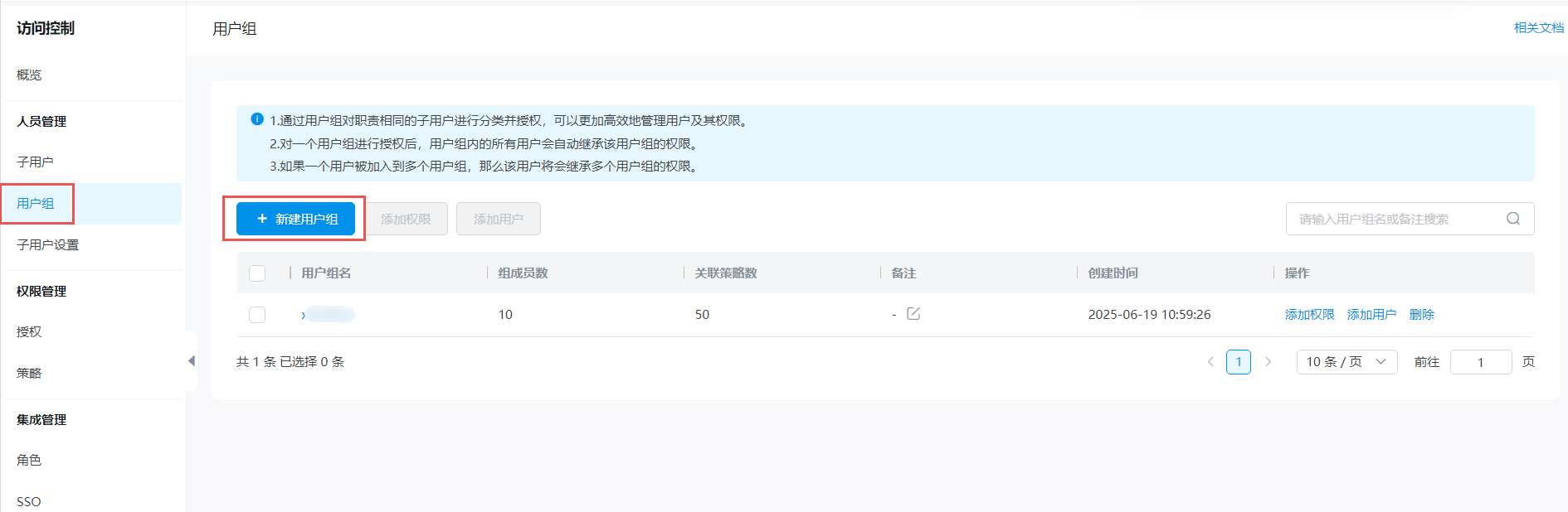 可以为用户组添加一个或多个权限策略,使加入到用户组的子用户具有资源的访问能力。