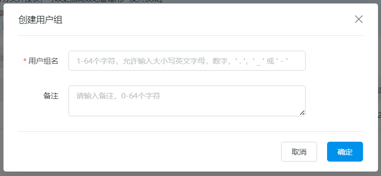 在创建用户组弹层填写用户组名和备注,单击“确认”,完成用户组创建。