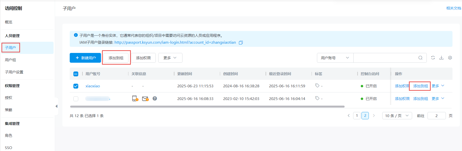 在子用户列表页面,单击目标子用户操作列的 添加到组。