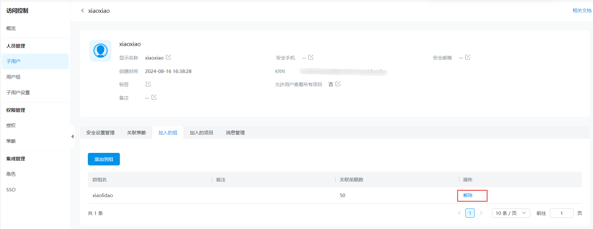 选择人员管理 > 子用户,进入到用户组管理页面。