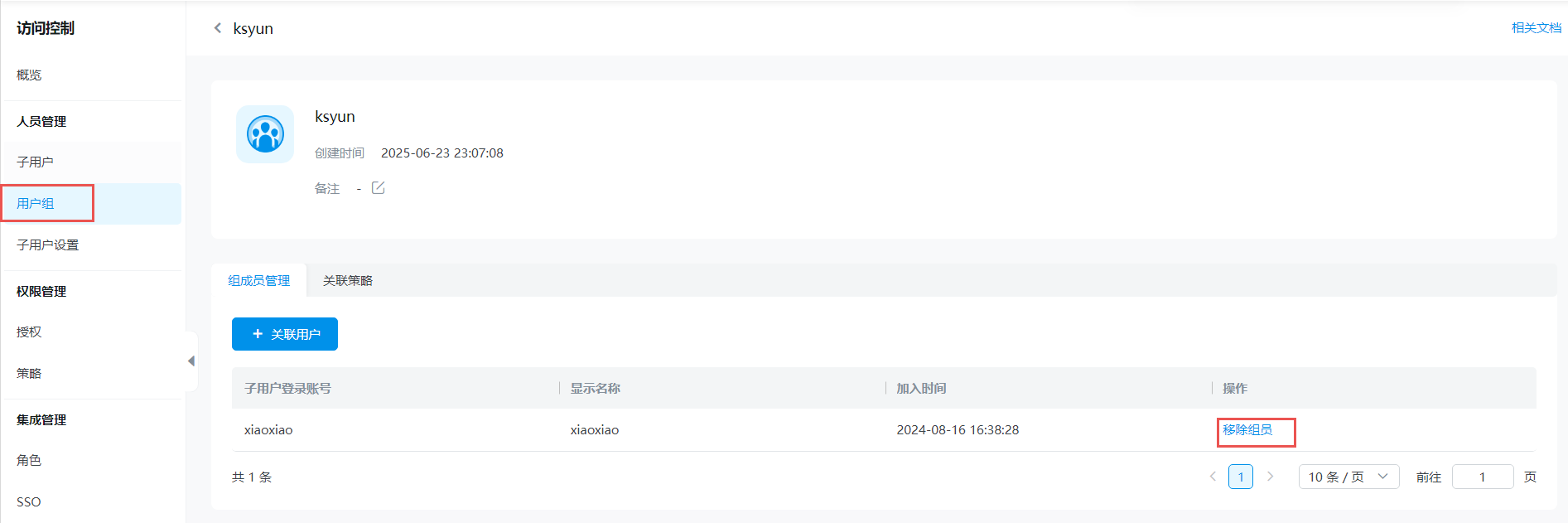 在组成员管理页签,单击目标子用户操作列的移出用户组。