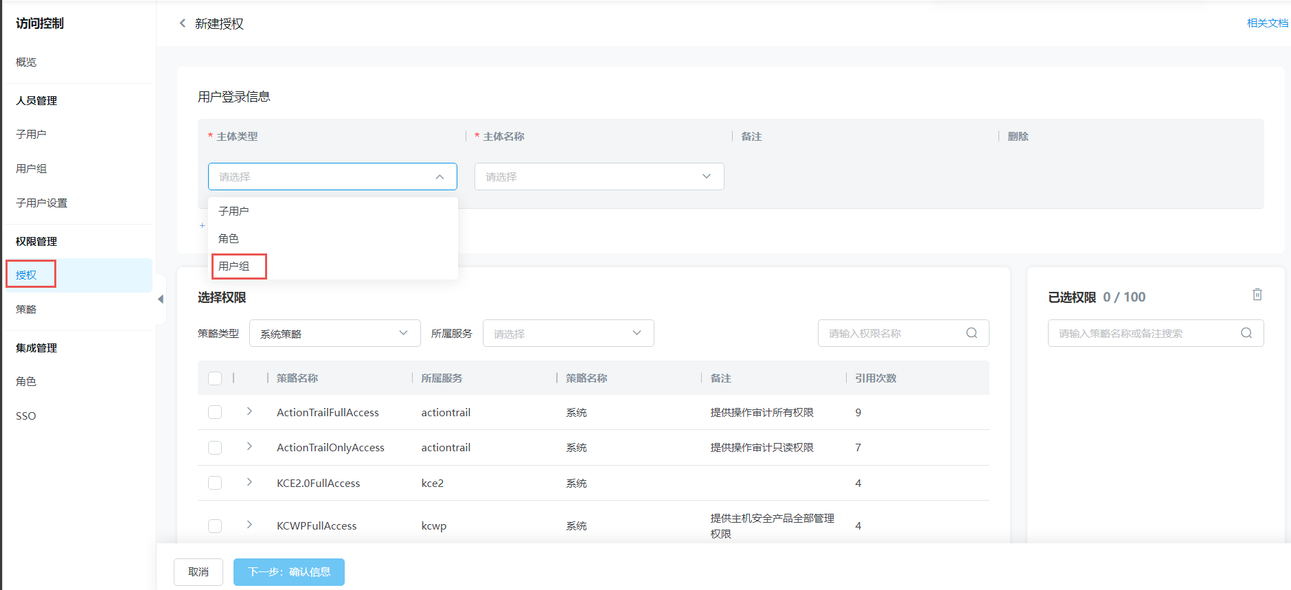 在新建授权面板,选择要授权的用户组和授权的策略。