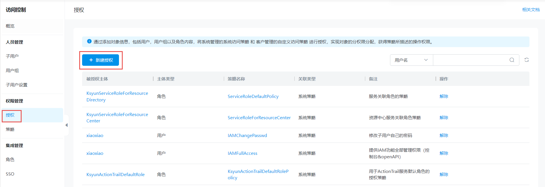 在授权列表页面, 单击新建授权按钮。
