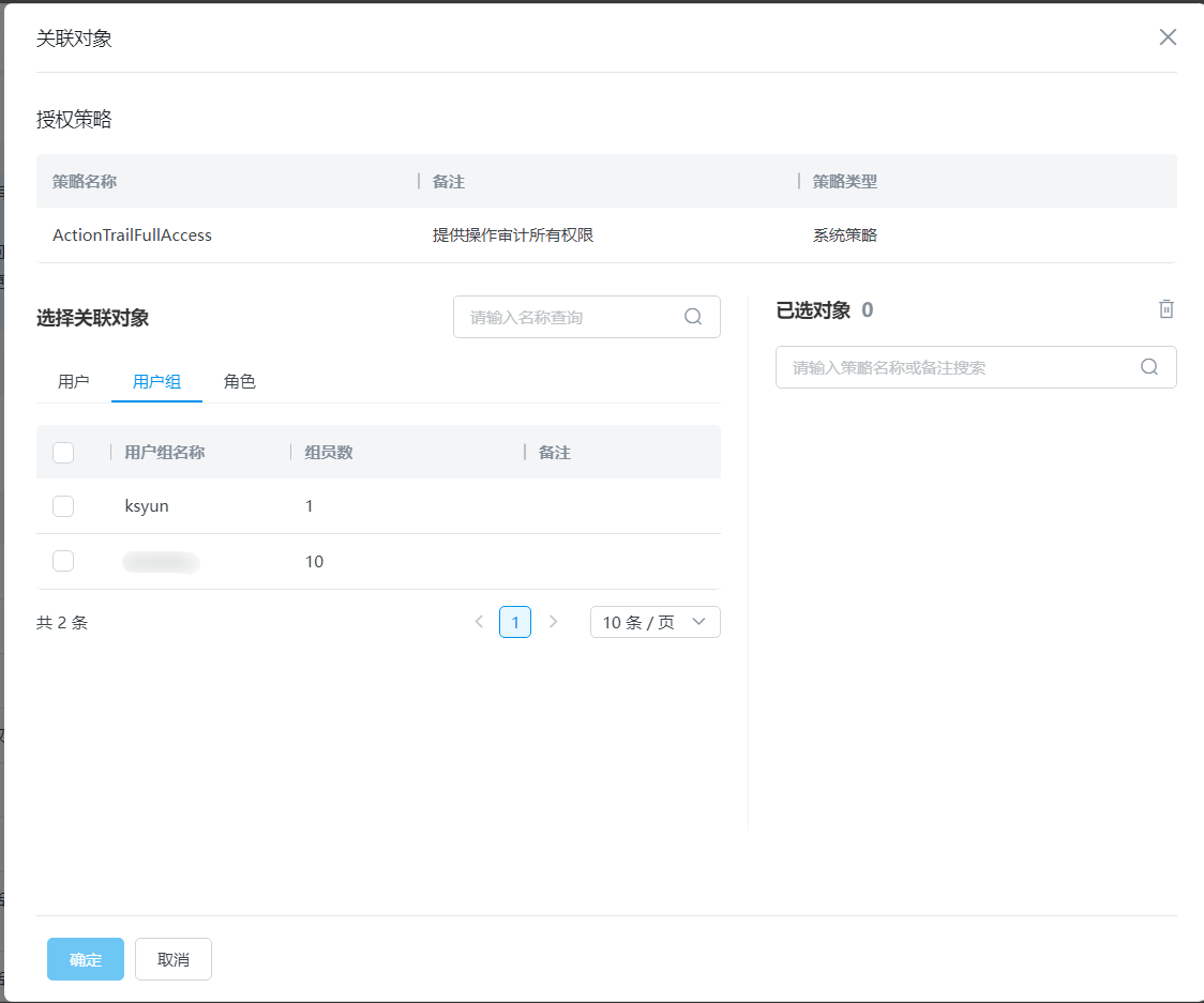 在关联对象面板,选择要授权的用户组。