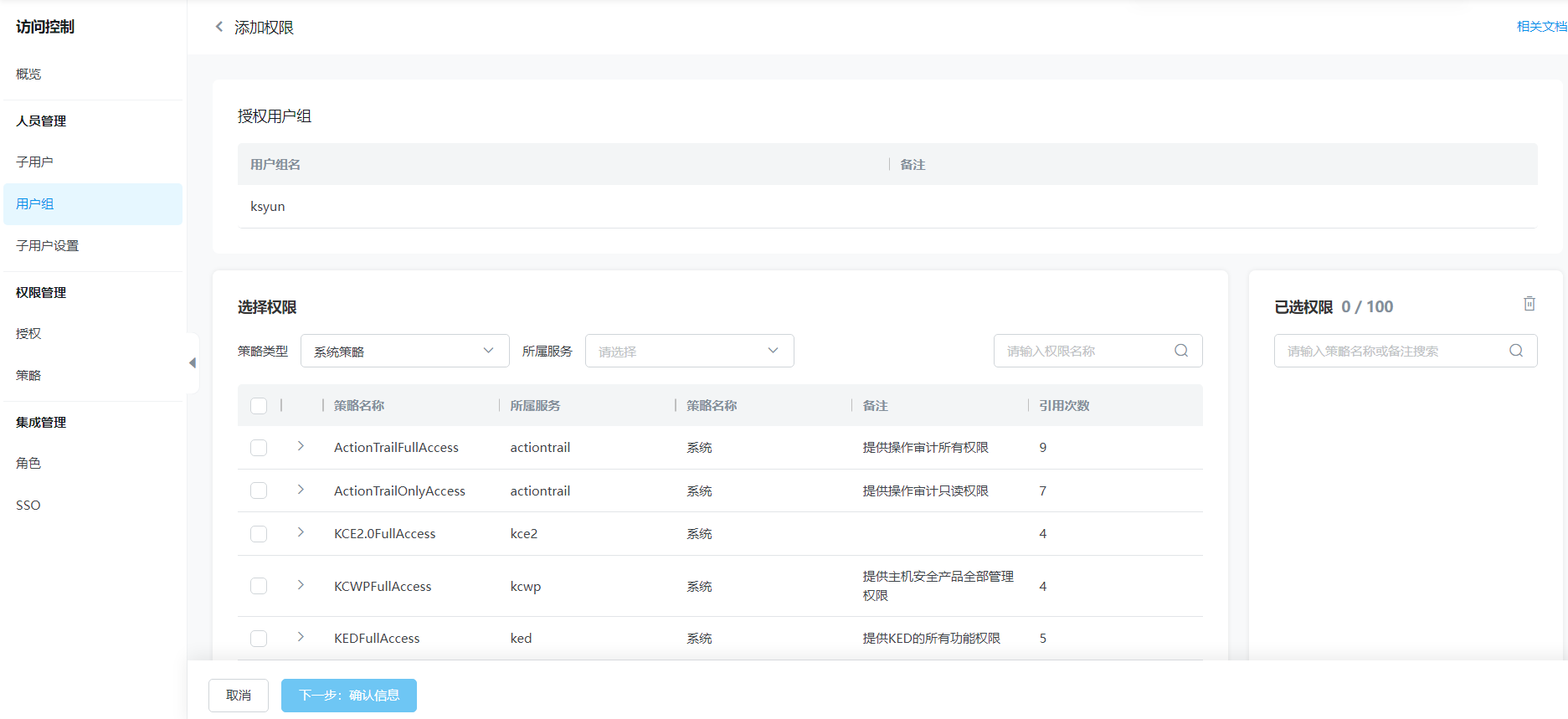 单击“下一步:确认信息”,完成权限添加。