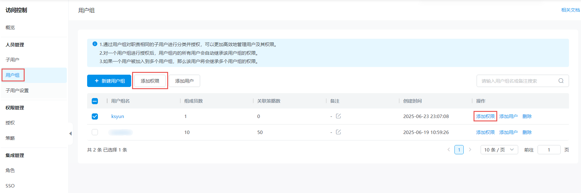 为用户组授权后,用户组中的所有子用户将拥有该用户组的权限。