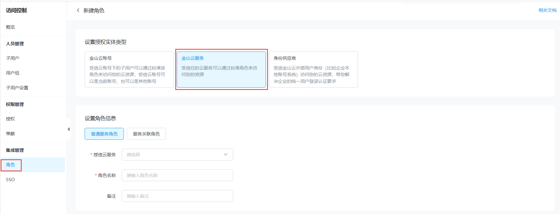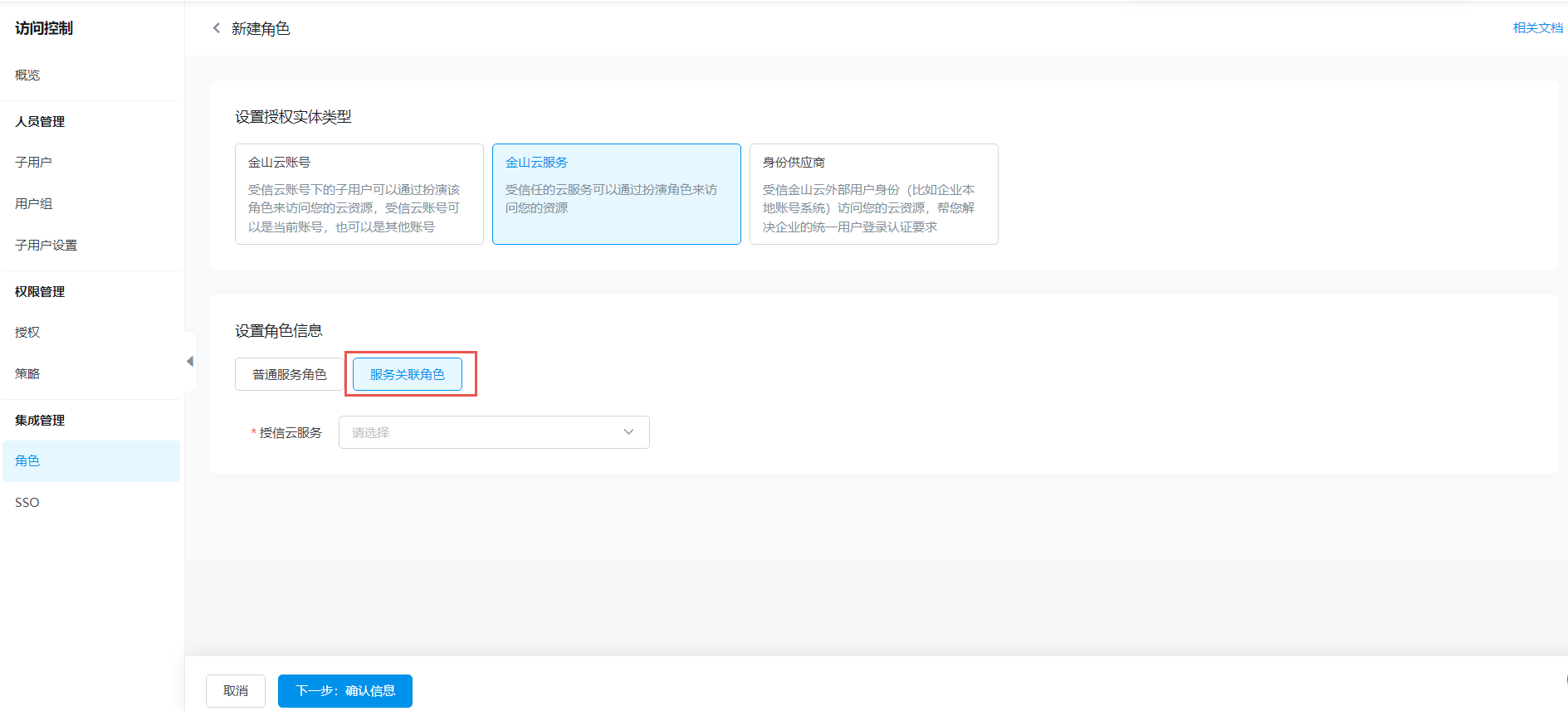 在新建角色页面中,设置授权实体类型为金山云服务。